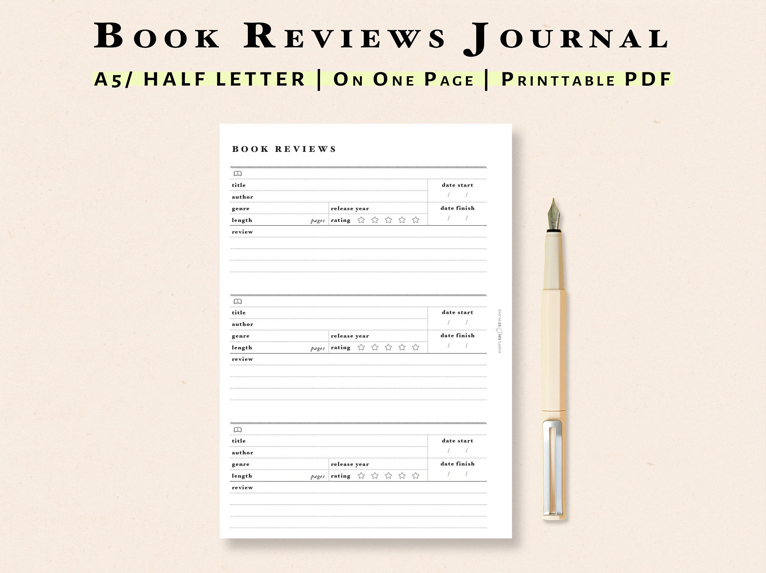 Book Review Journal A5 Half Letter Printable Pdf Simple Etsy